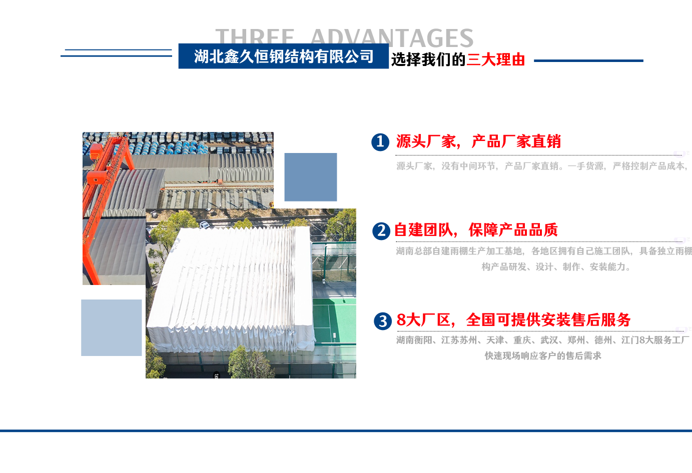 湖北鑫久恒鋼結(jié)構(gòu)有限公司是一家電動(dòng)雨棚、膜結(jié)構(gòu)車棚研發(fā),生產(chǎn)銷售,施工安裝于一體的專業(yè)鋼結(jié)構(gòu)科技公司,主要產(chǎn)品有伸縮雨棚,電動(dòng)雨棚,膜結(jié)構(gòu)車棚等。 湖南地區(qū)職員目前有80多人,占地面積20000平方米,廠房面積15600平方米,配備先進(jìn)的生產(chǎn)流水線,使每件品質(zhì)產(chǎn)品的堅(jiān)實(shí)基礎(chǔ)。 公司在蘇州、天津、重慶、武漢、德州、烏魯木齊、江門均設(shè)有服務(wù)工廠,總?cè)藛T共300多人,擁有專業(yè)的技術(shù)團(tuán)隊(duì),配備先進(jìn)的設(shè)備和流水線生產(chǎn),產(chǎn)能高,貨源充足,發(fā)貨速度快,服務(wù)區(qū)域廣。 移動(dòng)伸縮棚適用于通道臨時(shí)倉(cāng)儲(chǔ)、戶外運(yùn)動(dòng)遮陽、污水池遮蓋、能源交通、熱力化工、礦山、船舶制造及市政建設(shè)、物流、碼頭等領(lǐng)域的構(gòu)件制作加工,成品半成品存放、倉(cāng)庫、野外儀器設(shè)備操作用房等。尤其是對(duì)工廠發(fā)貨、倉(cāng)儲(chǔ)臨時(shí)遮雨防嗮,梅雨期較長(zhǎng)、建設(shè)周期較短的工程施工等特別適用。還可根據(jù)用戶需求量身定制、適合企業(yè)所需不同款式的產(chǎn)品。 我公司堅(jiān)持“誠(chéng)信社會(huì)為本,客戶滿意為榮”的經(jīng)營(yíng)理念,做到質(zhì)量把控,嚴(yán)格管理,精益求精,恪守承諾。使鑫久恒逐步走向成熟,其系統(tǒng)化、專業(yè)化日趨完善。以專業(yè)的技術(shù)、科學(xué)的管理,更高的產(chǎn)品質(zhì)量,優(yōu)良的企業(yè)信譽(yù),真誠(chéng)的客戶服務(wù),靈活多樣的經(jīng)營(yíng)方式和務(wù)實(shí)創(chuàng)新的企業(yè)精神愿與社會(huì)各界攜手合作,為推動(dòng)智能鋼結(jié)構(gòu)建筑事業(yè)的發(fā)展而不斷努力。...